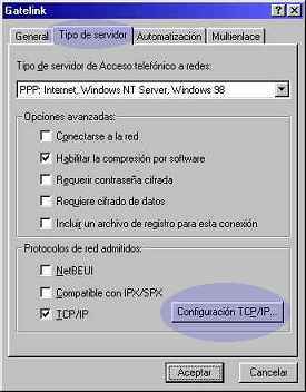 Una vez verificado estos parámetros hacemos click en el botón Aceptar y regresamos a la ventana anterior. A continuación seleccionamos la ficha Tipo de servidor en donde obtendremos una ventana con diferentes parametros: